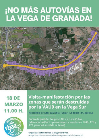 El sábado 18 de marzo, la plataforma Defendamos la Vega Otra Vez convoca una manifestación contra la construcción de más autovías en la Vega de Granada. En concreto, se recorrerá el territorio que se vería afectado por la construcción de la autovía VAU 9 en la Vega Sur.